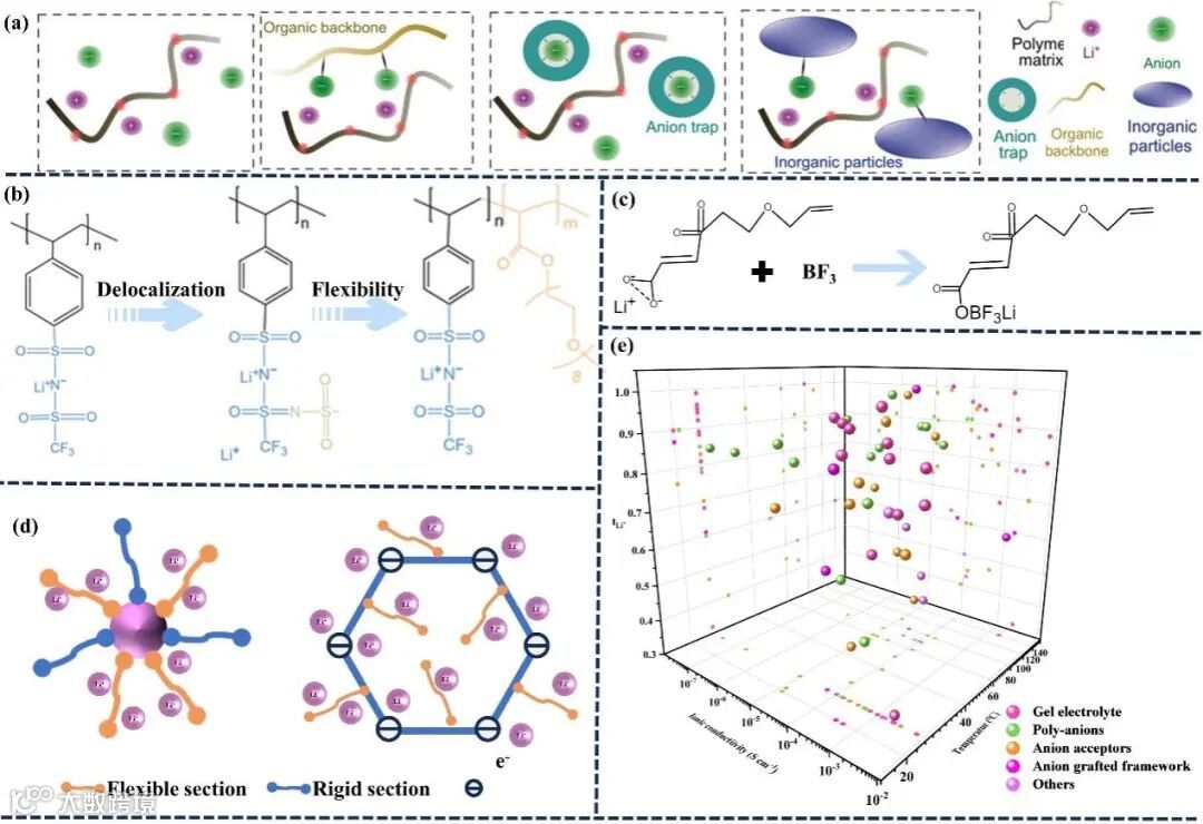 图5 (a) 抑制阴离子迁移的策略;(b) LiPSTFSI和LiPSsTFSI的分子结构式;(c) 阴离子受体作用机制; (d) 典型的阴离子接枝框架;(e) 不同温度下OSEs的锂离子电导率和锂离子迁移数的关系