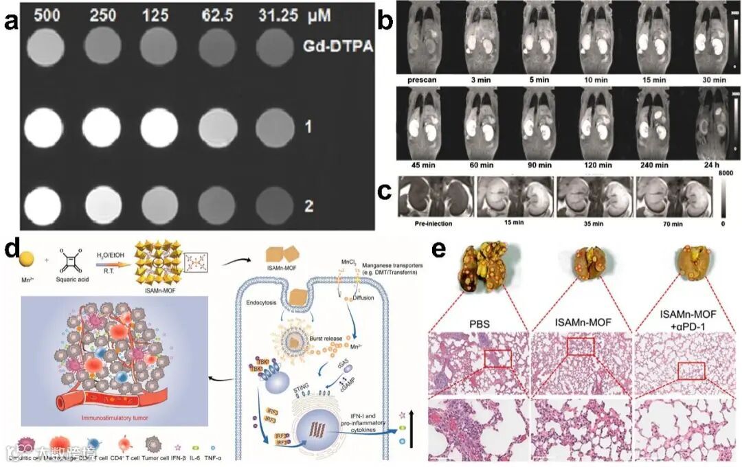 在医学影像方面,钆、锰、铁基MOF具备优异的MRI造影性能。其中,Gd-Cmdcp的弛豫率达13.46 mM–1·S–1,显著高于商用对比剂,能够提供更清晰的影像对比。这些MOF基造影剂不仅能提高诊断准确性,还能实现治疗一体化,为精准医疗开辟了新途径。