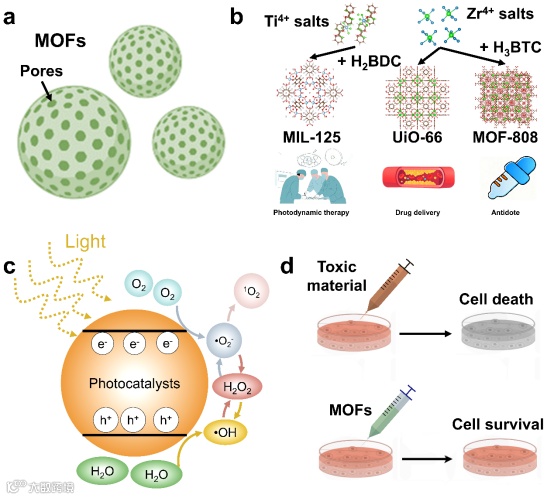 图1. MOF的多孔结构、ROS生成机制及生物相容性示意图