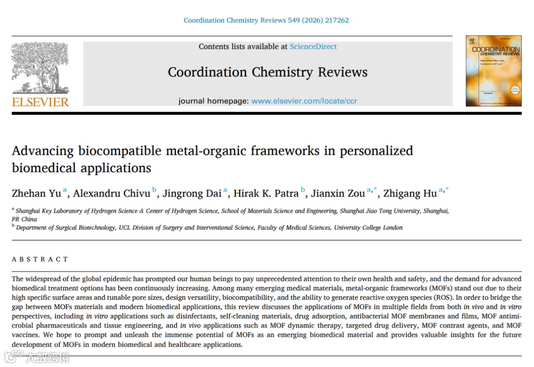 近日,上海交通大学材料科学与工程学院氢科学中心邹建新、胡志刚团队联合伦敦大学学院(UCL)外科生物技术系Hirak Patra教授团队在《Coordination Chemistry Reviews》上发表了题为“Advancing biocompatible metal-organic frameworks in personalized biomedical applications”的综述文章。该论文系统总结了金属有机框架(MOF)材料在生物医学领域从基础防护到临床治疗的前沿进展,全面叙述了其材料特性、生物机制、应用体系与转化前景,为MOF材料向个性化生物医用应用的转化提供了系统的科学基础。