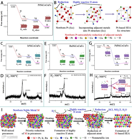 理论验证:DFT 计算表明,贵金属表面的 H₂解离生成高活性氢原子(ΔG₍H-des₎=-0.984 eV),协同还原邻近金属离子并嵌入晶格,形成 Pt 基 fcc 固溶体。Ir、Ru 体系表现类似机制,但 Pd 因氢脱附能高(ΔG₍H-des₎=0.031 eV)无法形成固溶体。