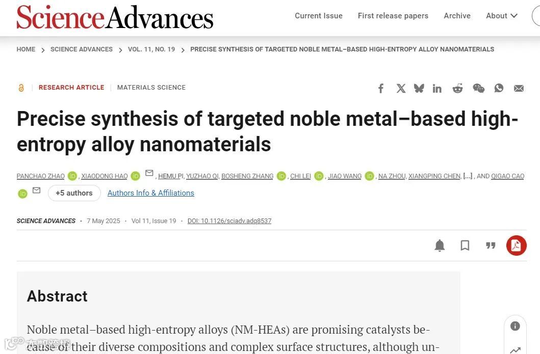 P. Zhao, X. Hao*, H. Pi, Y. Qi, B. Zhang, C. Lei, J. Wang, N. Zhou, X. Chen, D. Kan*, B. Xu, G. Zhang*, J. Chen*, W.Yi*, Q. Cao*, Precise Synthesis of Targeted Noble-Metal-Based High-Entropy-Alloy Nanomaterials, Science Advances, 2025. 11, eadq8537.