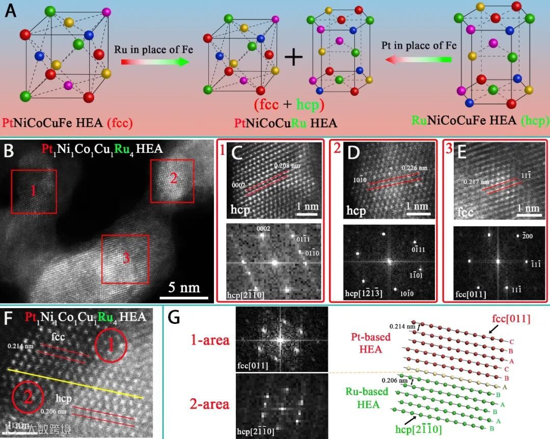 图4. PtNiCoCuRu 高熵合金中相组成的精确设计。(A) PtNiCoCuRu 高熵合金的示意图,其包含fcc和hcp晶体结构。(B) 在 300°C 下获得的 Pt₁Ni₁Co₁Cu₁Ru₄高熵合金三维纳米框架的HAADF-STEM图像。插图(C-E)对应的快速傅里叶变换(FFT)图谱。(F) Pt₁Ni₁Co₁Cu₁Ru₄高熵合金的HAADF-STEM图像,在单个纳米颗粒中包含fcc和hcp结构。(G)对应的快速傅里叶变换(FFT)图谱,以及fcc和hcp相的原子排列示意图。