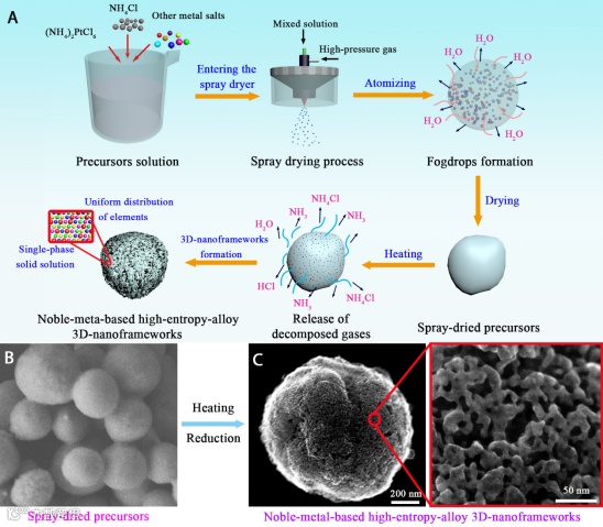 图 1. Pt基高熵合金三维纳米框架的合成过程及微观性质示意图。(A) 高熵合金三维纳米框架的合成过程。(B)经雾化干燥充分混合的前驱体的扫描电子显微镜图像。(C) 纳米级高熵合金三维纳米框架的二次电子扫描透射电子显微镜图像。