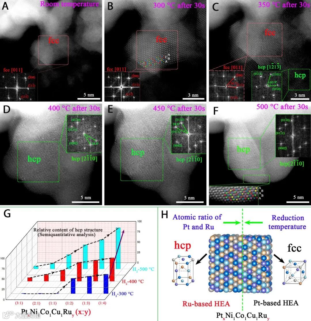 双相控制策略:通过调整 Pt/Ru 比例(x:y=3:1 至 1:4)和还原温度(300°C 至 500°C),实现 Pt 基 fcc 向 Ru 基 hcp 的相转变。原位 STEM 动态观察显示,350°C 开始出现 hcp 晶核,500°C 时 fcc 完全转化为 hcp。