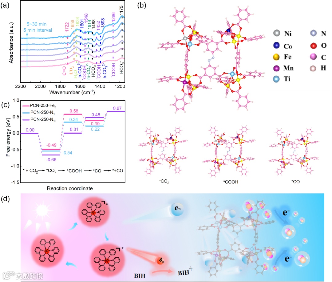 原位表征与理论计算揭示了PCN-250-N10催化CO2还原的原子级反应路径。通过原位红外光谱捕获CO2还原过程中的关键中间体,1548、1432、1266 cm⁻¹归属于*COOH中间体特征峰,并且所有峰强度随光照时间增加而增强,证实CO2还原反应持续进行。通过DFT理论计算得到吸附过程中间体的晶体结构以及分析每步反应的能垒,结果表明PCN-250-N10的CO2吸附和形成*COOH能垒更低,因此强的CO2吸附能有利于稳定初始金属CO2加合物和促进二氧化碳减排过程。DFT计算与原位红外光谱测试完美吻合,因此提出光催化过程是光敏剂受光激发产生光生电子,随后光生电子被转移至混合金属-氧簇的活性位点,催化剂吸收CO2分子通过质子耦合电子转移过程转化为CO(图6)。