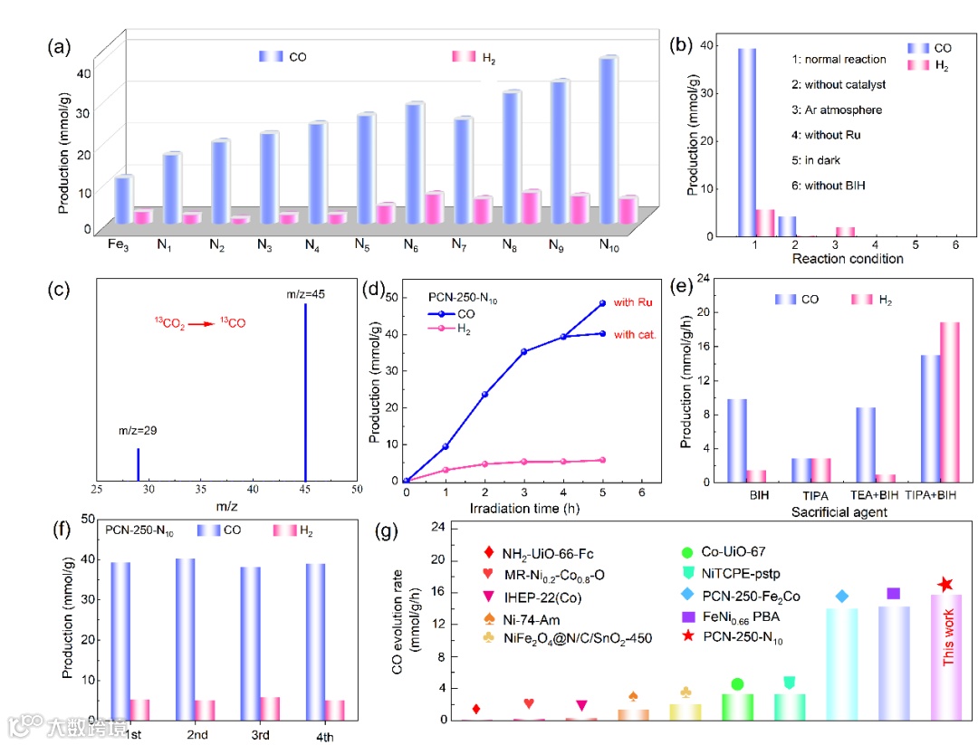 Figure 3. (a) CO generation rate in the process of Photocatalytic CO2 Reduction over PCN-250 series. (b) CO2 photoreduction performance at different reaction conditions. (c) Mass spectra of reaction products of photocatalytic CO2 reduction using PCN-250-N10 as the catalyst (13CO2 as the gas environment). (d) Comparison of activity in the existence and absence of photosensitizers after 4 hours of reaction with PCN-250-N10. (e) CO2 photoreduction performance under different sacrificial agents. (f) The recycling stability of PCN-250 Series. (g) Comparison chart of performance with reported literature.