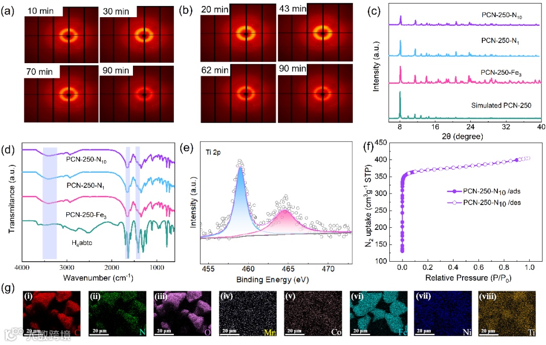 Figure 2. (a) Neutron diffraction patterns of PCN-250-N1 at different times under N2 atmosphere, 10 minutes, 30 minutes, 70 minutes, 90 minutes. (b) Neutron diffraction patterns of PCN-250-N1 at different times during CO2 atmosphere blowing, 20minutes, 43 minutes, 62 minutes, 90 minutes. (c) The XRD patterns of PCN-250-Fe3, PCN-250-N1, and PCN-250-N10. (d) FT-IR spectra of the PCN-250-Fe3, PCN-250-N1, and PCN-250-N10. (e) High-resolution XPS spectra of the Ti 2p of PCN-250-N10. (f) The Nitrogen adsorption of PCN-250-N10. (g) SEM mapping images of PCN-250-N10.