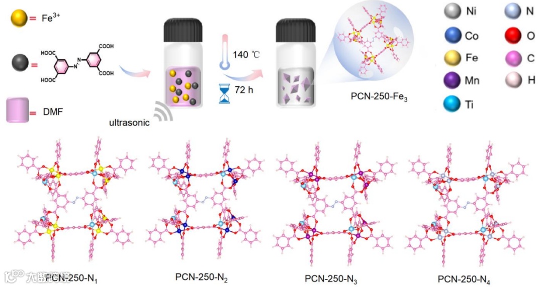 通过将Ti4+与其他过渡金属(如Fe、Co、Ni、Mn)结合,构建了多元金属氧簇MOFs(PCN-250-Nn系列)。这种设计不仅保留了Ti基MOFs的高稳定性,还通过多元金属协同效应显著提升了催化活性。