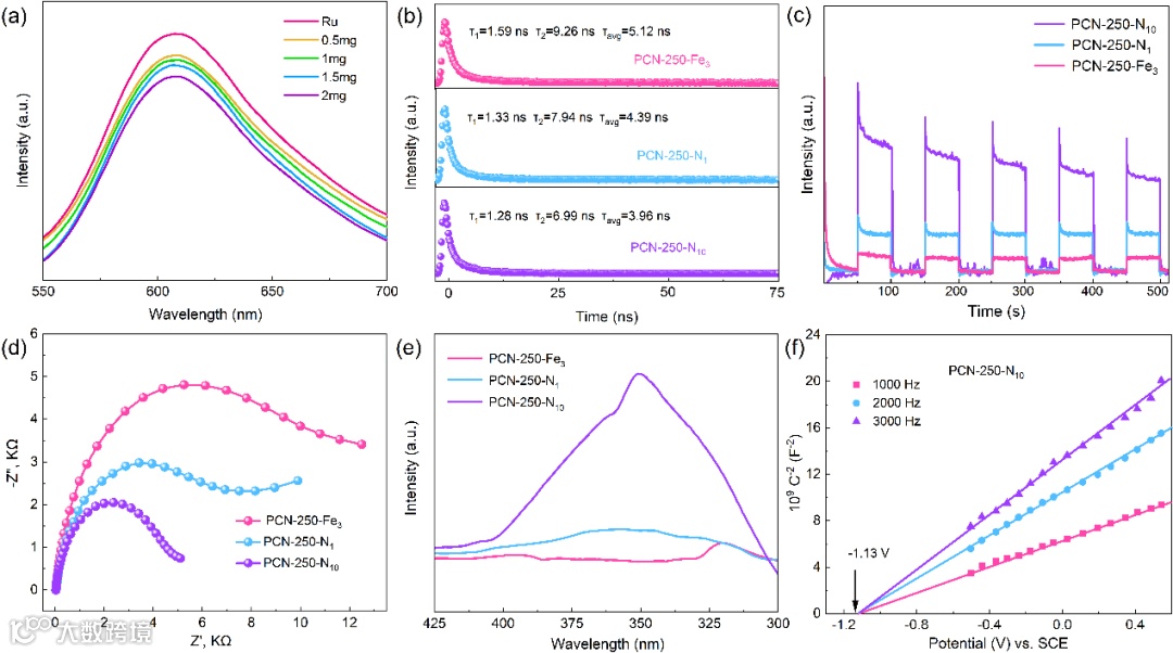 Figure 4. (a) Photoluminescence spectra. (b) time-resolved PL spectra (c) Transient photocurrent response for PCN-250-Fe3, PCN-250-N1, and PCN-250-N10 without Ru. (d) EIS Nyquist plots of the prepared electrodes covered with the PCN-250-Fe3, PCN-250-N1, and PCN-250-N10. (e) Photovoltage diagram of the PCN-250-Fe3, PCN-250-N1, and PCN-250-N10. (f) The Mott-Schottky plots of PCN-250-N10.
