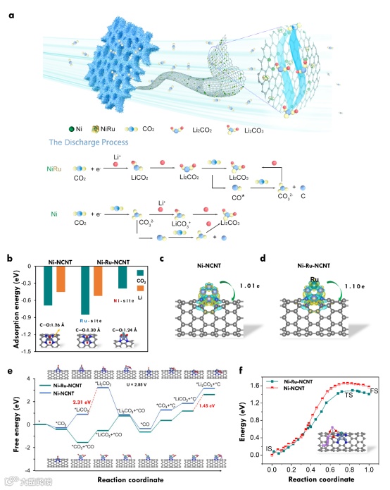 图6 a) Li2CO3 和 C 形成路径示意图。b) Ni-NCNT 和 Ni-Ru-NCNT 上的 CO2 和 Li 的吸附能示意图。c-d) Ni-NCNT 和 Ni-Ru-NCNT 的电荷密度差异。e) 在 U = 2.85 V 时,在 Ni-NCNT 和 Ni-Ru-NCNT 上Li-CO2 电池中最优反应路径的自由能图。f) Li2CO3 在 Ni-NCNT 和 Ni-Ru-NCNT 上的分解能垒。图例展示了吸附物的几何结构。