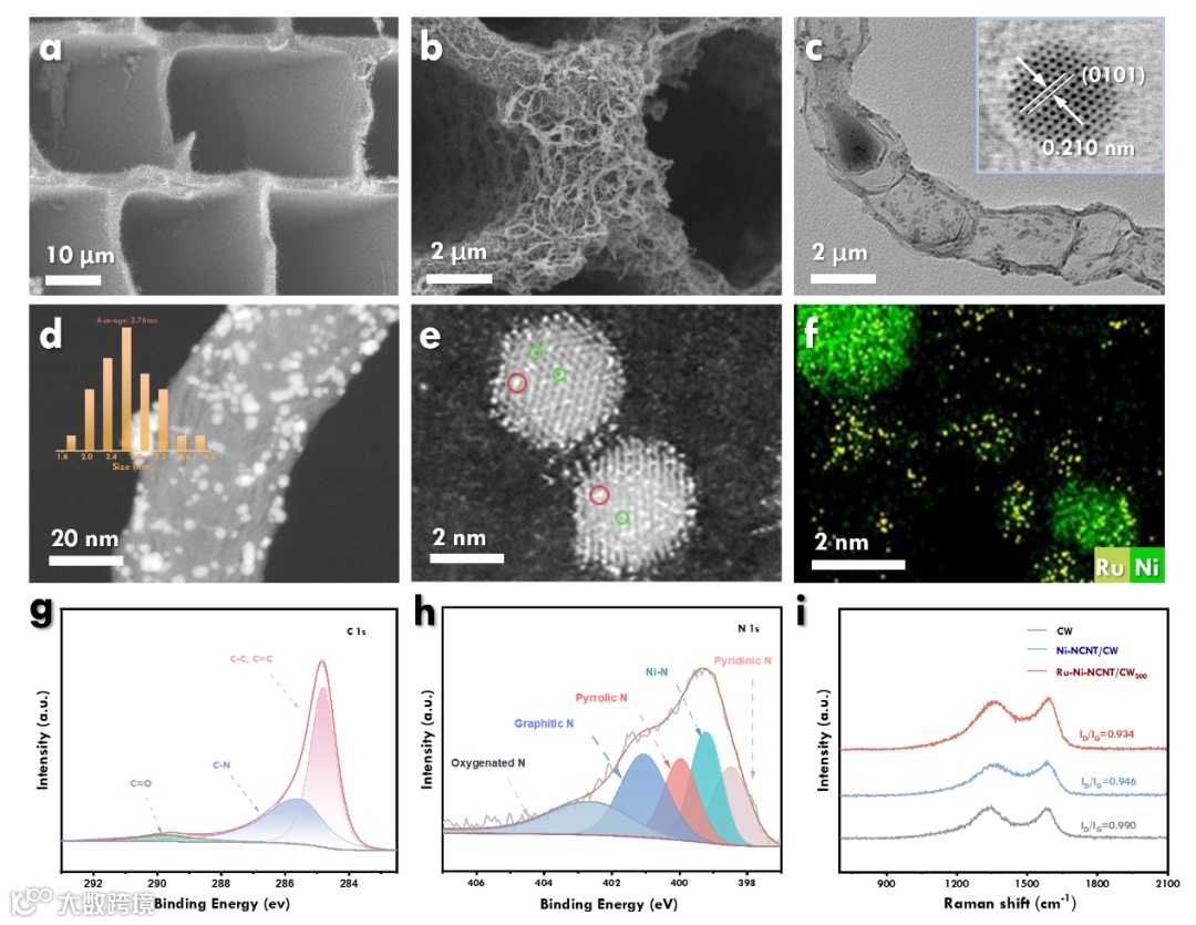 图2 a-b)Ni-NCNT/CW 和 Ni-Ru-NCNT/CW300 的SEM图像。c)Ni-RuNCNT/CW300 的TEM(插图为相应的HAADF-STEM图像)。d-e)Ni-Ru-NCNT/CW300 的HAADF-STEM图像。f)Ni-Ru-NCNT/CW300 中镍和钌的EDS图。g-h)Ni-Ru-NCNT/CW300 的XPS图谱(g)C 1s 谱,(h)N 1s 谱。i)CW、Ni-NCNT/CW·和 Ni-Ru-NCNT/CW300 的Raman图谱。