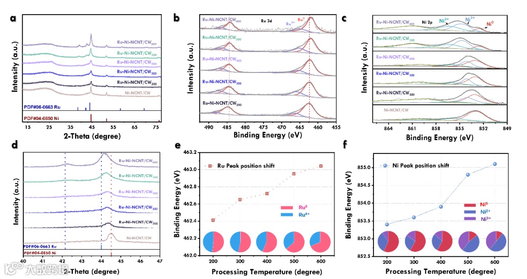 图3 a) Ni-NCNT/CW 和 Ni-Ru-NCNT/CW 的 XRD 图像。b) Ni-Ru-NCNT/CW 的高分辨率 XPS 3p图谱。c) Ni-NCNT/CW 和 Ni-Ru-NCNT/CW 的高分辨 XPS 2d图谱。d) Ni-NCNT/CW 和 Ni-Ru-NCNT/CW 的 XRD 放大图像。e-f) Ru(Ni) 主峰的位置以及 Ru0 (Ni2+) 在 Ru (Ni) 元素中的比例随温度变化图像。