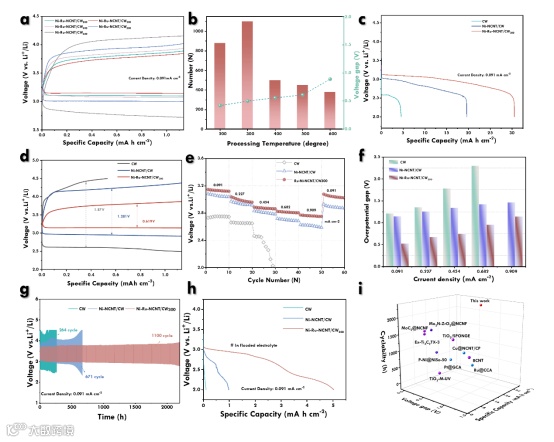 1.在0.091 mA cm-2的电流密度下,Ni-Ru-NCNT/CW300表现出34.68 mA h cm-2的超高面积比容量,同时展现出极低的极化电压和优异的循环稳定性(图4a-c)。这一优异的电化学性能可归因于Ni-Ru合金化效应优化了电子结构,同时多级碳结构为还原产物沉积提供了充足的空间,从而显著提升了催化反应动力学。