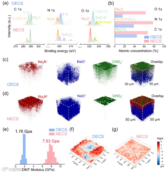 图3. SEI的形貌和结构。(a)在OECS和NECS中,Na金属SEI溅射30 s形成的C1s、N1s和O1s的XPS光谱;(b)在Na金属SEI溅射30 s过程中,OECS和NECS中形成的含O和含N物质的无机组分的统计图;TOF-SIMs的Na三维视图2N−,NaO−,CHO2−,并由(c)OECS和(d)NECS中从循环的Na负极溅射的二次离子物质叠加,溅射速度为10 nm min−1,溅射面积为50×50μm2;(e)OECS和NECS在工作Na负极下形成SEI的杨氏模量统计量的比较;循环后 Na||Na 电池剥离状态的 3D 表面形貌粗糙度循环后分析(f)OECS和(g)NECS中的Na负极。