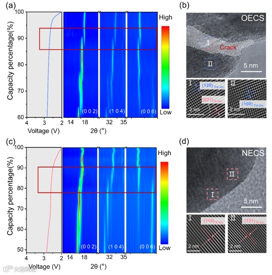 图4. NFM正极的相演变与界面表征。(a,c)在初始放电过程中(从0.6 mAh至2.0 V截止电压)通过非原位XRD获得的(a)OECS和(c)NECS中的多峰等高线图;(b)OECS和(d)NECS中循环后NFM正极表面微观结构的高分辨TEM图像,以及不同区域对应的快速反傅里叶变换结果。
