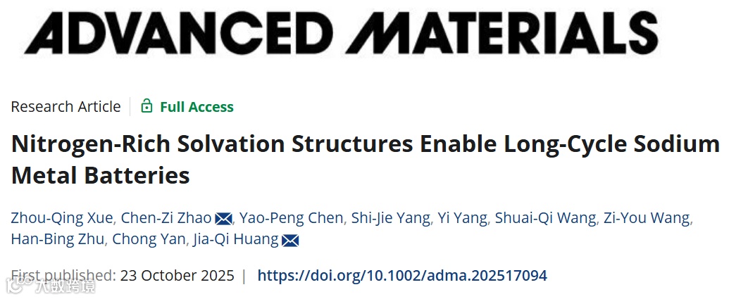 近日,北京理工大学黄佳琦、清华大学赵辰孜团队合作,在国际知名期刊Advanced Materials上发表题为“Nitrogen-Rich Solvation Structures Enable Long-Cycle Sodium Metal Batteries”的研究性文章。本文针对钠金属电池中电极界面不稳定这一核心挑战,提出了一种氮富集配位溶剂化结构的设计策略,来调控并稳定电极界面。该设计能够在负极诱导形成高机械强度的无机界面膜,有效抑制钠枝晶生长;同时在正极构筑坚固的保护层,显著增强其结构稳定性和反应可逆性。这项研究为实现高能量密度、长循环寿命的钠金属电池提供了一种通用的溶剂化结构调控方案。
