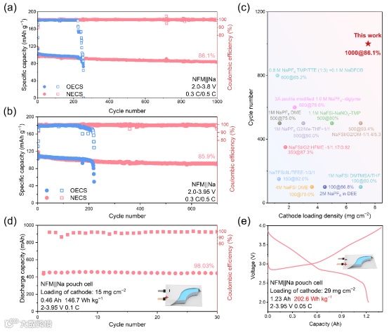 基于NECS电解质构建的钠金属全电池在接近实用化的苛刻条件下,展现出突破性的电化学性能,关键数据有力地证明了其优越性。在电池核心测试中,Na||Na对称电池实现了超过4000小时的超长稳定循环,证明了负极界面极高的可逆性。匹配高负载(7.5 mg cm−2)NFM正极的Na||NFM全电池在2.0-3.8V电压范围内,经过1000次循环后容量保持率高达86.1%,平均库伦效率达到99.9%,远超使用传统电解质(OECS)的电池。更重要的是,该策略提升了电池的工作电压窗口,当电压上限拓展至3.95V时,全电池依然能在700次循环后保持85.9%的容量。最终,基于NECS组装的NFM||Na软包电池实现了202.6 Wh kg−1的高能量密度。这些扎实的数据不仅验证了NECS策略的实际可行性,更阐明了通过微观溶剂化结构调控来实现宏观电极界面同步稳定的核心原则,为解决下一代高能量密度金属电池的界面难题提供了普适性的设计蓝图和理论基石。