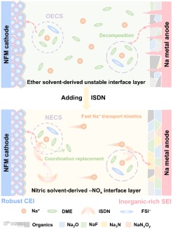 图1. 添加富氮共溶剂异山梨二硝酸盐(ISDN)形成富氮配位溶剂化结构的示意图,ISDN在工作SMBs的正极和负极处形成稳定的界面。