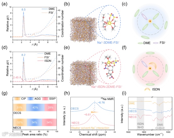 图2. 溶剂化结构的分析。(a–f)溶剂化结构中Na配位数(n(r))以及(a,b)OECS和(d,e)NECS 中第一个溶剂化壳层的MD模拟;(c)OECS和(f)NECS中第一个溶剂化壳的示意图;(g)SSIP、CIP和AGG在FSI−拉曼光谱中的相应比例和两种电解质中的特征峰;(h)OECS和NECS中的1H NMR波谱;(i)OECS 和 NECS中的FTIR光谱。