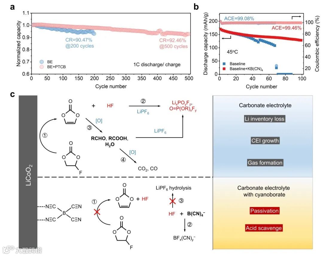 多氰基盐添加剂([X(CN)n]−)利用了氰基跟钴酸锂表面的强相互作用,而阴离子的设计增强了与正极表面的相互作用的同时解决了与负极兼容的问题。通过配体中心筛选出稳定性强、吸附作用强的四氰基硼酸盐,抑制了溶剂分子在高压正极表面的脱氢产酸,同时配体交换的机制赋予了添加剂清除HF的能力,进一步保证了高压界面的稳定。