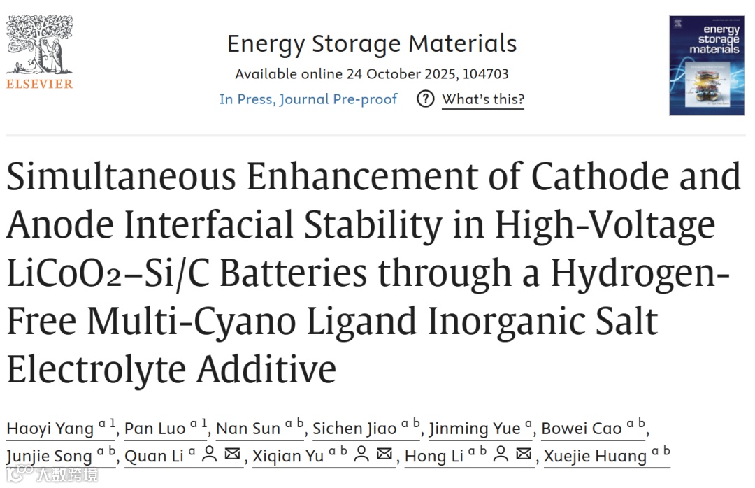 近日,来自中科院物理所的禹习谦/李泓研究员团队,在国际知名期刊Energy Storage Materials上发表题为“Simultaneous Enhancement of Cathode and Anode Interfacial Stability in High-Voltage LiCoO₂–Si/C Batteries through a Hydrogen-Free Multi-Cyano Ligand Inorganic Salt Electrolyte Additive”的研究文章。该文章首次提出了含有多氰基配体的盐作为高压钴酸锂电解液的添加剂,通过配体中心的筛选,确定了化学/电化学稳定、强界面吸附的四氰基硼酸盐([B(CN)4]−),同时稳定正、负极界面,在钴酸锂-硅碳软包中取得了优异的循环性能,为功能添加剂分子设计提供了新思路。