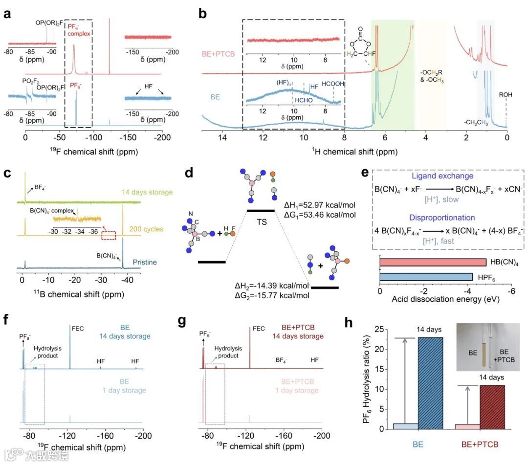 利用液体核磁中探究了电解液中添加剂的作用机理,在高压钴酸锂全电池循环后,四氰基硼酸盐添加剂的加入明显抑制了HF等质子酸性物质和六氟磷酸锂水解产物的产生,同时伴随着四氰基硼酸盐转化成BF4−。通过理论计算和核磁实验,验证了四氰基硼酸盐添加剂能够通过配体交换反应清除电解液中的HF,防止电解液的产酸降解。