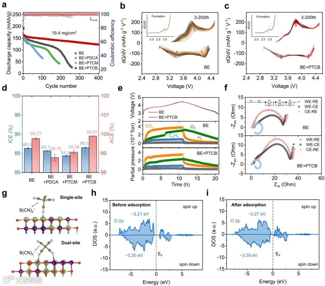 在19 mg/cm2的钴酸锂商用负载下,对比不同电解液添加剂的效果。稳定性差的二氰胺和三氰基甲烷盐导致全电池的寿命迅速衰减,甚至差于无添加剂的基础商用电解液(六氟磷酸锂-碳酸酯体系),而具有高化学/电化学稳定性的四氰基硼酸盐提升了电池的循环稳定性,明显优于常见的二腈(ADN)、三腈(HTCN)添加剂。通过DFT计算钴酸锂表面的吸附,四氰基硼阴离子具有极强的吸附能,其吸附后降低了氧的p带中心,从而抑制了过渡金属氧化物的脱氢活性,从源头上阻止了电解液在正极表面的脱氢分解反应。