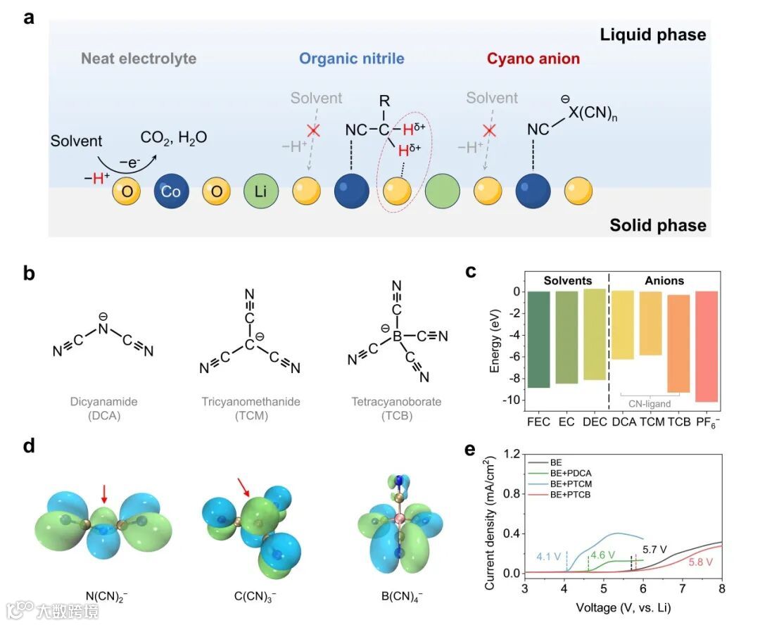 有机腈类(R-CN)是钴酸锂最常用的添加剂,其作用机理源于强的钴-氰基相互作用,降低钴酸锂表面活性,抑制界面副反应。最近的研究表明含有多氰基的腈类分子与钴酸锂具有更强的表面相互作用,从而更有效地抑制了高压钴酸锂的反应活性。然而有机腈类由于强吸电子的氰基存在,导致邻位的氢酸性较强,容易与金属锂等负极发生化学反应,导致全电池中的活性锂损失。在本工作中,将该作用机制的核心官能团——氰基设计到不含活性氢的盐中,多氰基的阴离子([X(CN)n]−;X=N,C,B,n=2,3,4)容易在钴酸锂正极表面富集,降低表面活性,从而抑制溶剂分子吸附、分解。同时考虑电化学和化学稳定性,sp3杂化的四氰基硼([B(CN)4]−)具有更高的耐氧化性和对水的稳定性,而二氰胺([N(CN)2]−)和三氰基甲烷([C(CN)3]−)阴离子具有较差的稳定性。