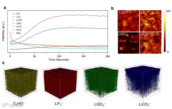 图 5 界面成分分析:a) NWO 电极循环 50 周后的 TOF−SIMS 深度剖析谱;b) C₂HO⁻、LiF₂⁻、LiSO₃⁻、LiCO₃⁻信号的 TOF−SIMS 映射图;c) C₂HO⁻、LiF₂⁻、LiSO₃⁻、LiCO₃⁻的 TOF−SIMS 图