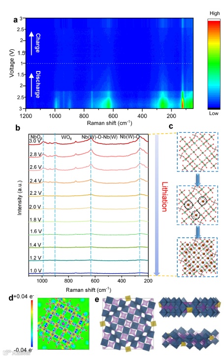 图 3 原位拉曼揭示锂插层位点:a) NWO 在充放电过程中的原位拉曼光谱;b) NWO 在特定电位下的拉曼光谱;c) 锂离子插层及配位位点的示意图;d) 因 Li 离子配位导致的相邻 Nb (W) 与 O 的电荷差分布;e) NWO 的键价位点能(BVSE)分析结果