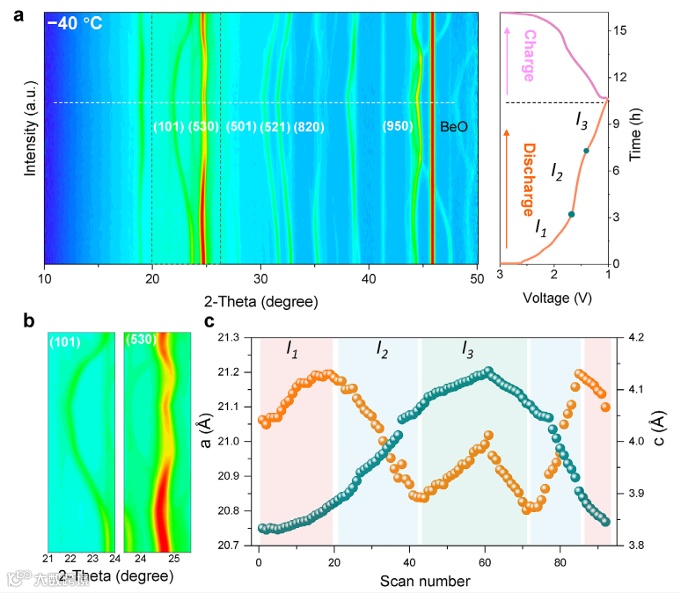 图 4 原位 XRD 揭示低温下锂插层机制:a) NWO 在–40°C 充放电过程中的原位 XRD 图谱及对应电压曲线;b) (101) 和 (530) 晶面的 XRD 峰局部放大图;c) 通过原位 XRD 精修获得的 NWO 晶格在充放电过程中的演化情况。
