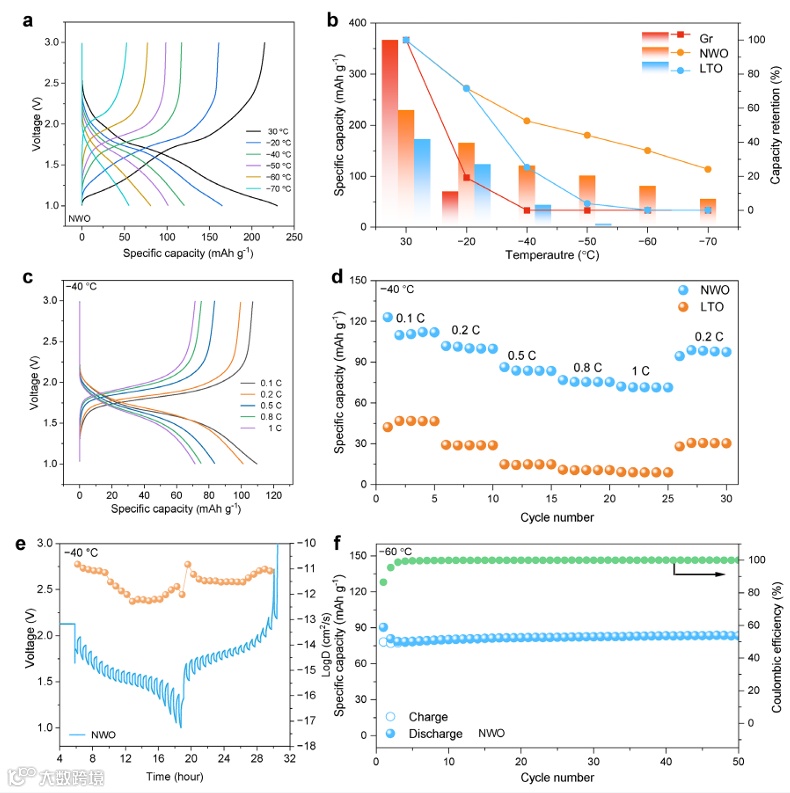 图 2 NWO 在低温下的电化学性能:a) NWO 在 + 30 至–70°C、0.1C 倍率下的充放电曲线;b) NWO 与 Gr、LTO 在不同低温下的比容量及容量保持率对比;c) NWO 在–40°C、不同电流密度下的充放电曲线;d) NWO 和 LTO 在–40°C 下的倍率性能对比;e) NWO 的 GITT 曲线及由 GITT 计算得到的 Li⁺离子扩散系数;f) NWO 在–60°C 下的循环性能