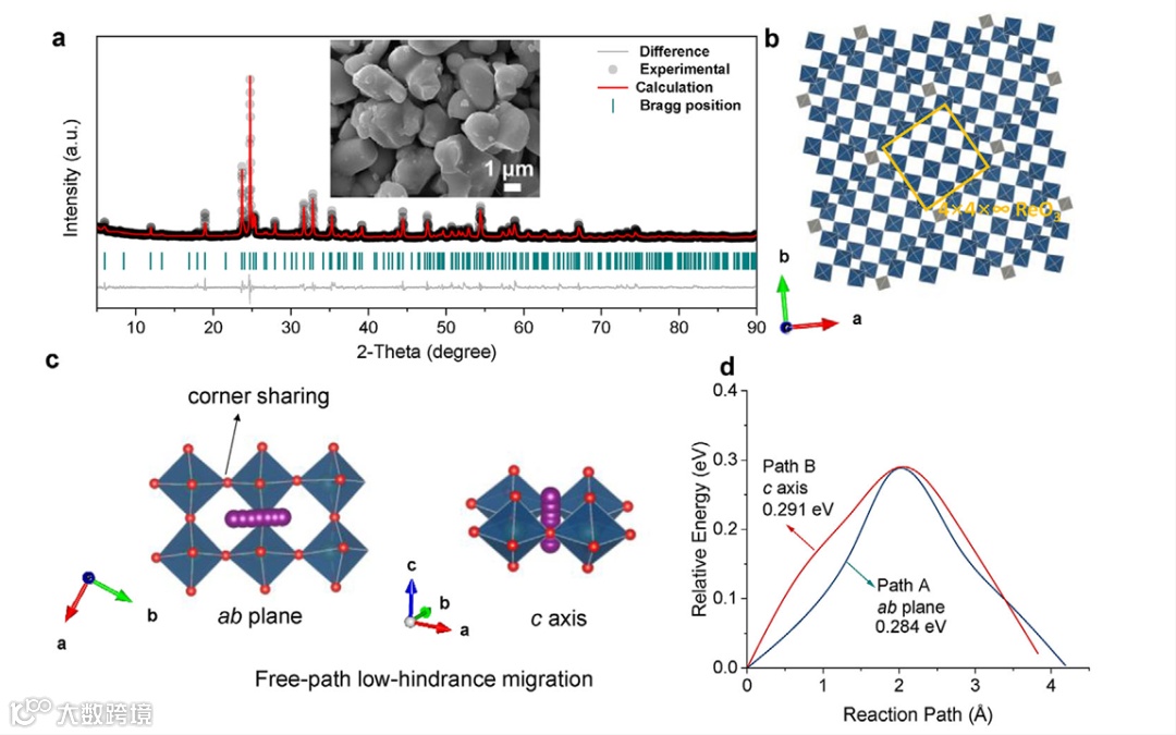 图 1 NWO 的自由路径低阻碍迁移:a) NWO 的 XRD 图谱及 Rietveld 精修结果,插图为基于 SEM 观察到的微米级 NWO 形貌;b) NWO 的晶体结构示意图;c) 锂离子沿 ab 平面和 c 轴进行自由路径低阻碍迁移的示意图;d) NWO 中计算得出的锂离子迁移活化能垒