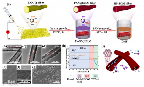 图1. 中空纤维共价有机框架(HF-SCOF)的制备方法、中空纤维的形貌及其氢钒离子选择性调控机制。