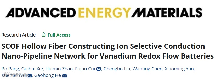 近日,来自大连理工大学的贺高红教授、吴雪梅教授和崔福军工程师在国际知名期刊Advanced Energy Materials上发表题为“SCOF Hollow Fiber Constructing Ion Selective Conduction Nano-Pipeline Network for Vanadium Redox Flow Batteries”的观点文章。该观点文章提出了共价有机框架(SCOF)材料的中空纤维形貌调控机制,以及中空纤维SCOF连续纳米管网调控钒液流电池中氢钒离子选择性的作用机制。