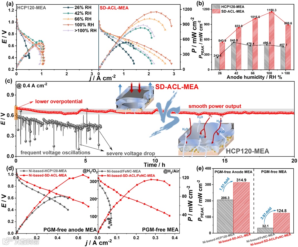 图2.(a)在背压为100 kPa、H2/O2条件下,HCP120-MEAs和SD-ACL-MEAs在不同阳极气体加湿情况下的单电池测试,阳极加湿情况分别为:26% RH (50 °C), 42% RH (60 °C), 66% RH (70 °C), 100% RH (80 °C), >100% RH (85 °C)。(b)不同阳极加湿情况下的MEA峰值功率密度直方图。(c)SD-ACL-MEA和HCP120-MEA 在0.4 A cm-2条件下的稳定性测试。(d)H2/O2条件下,基于阳极非贵的Ni-based-SD-ACL-MEA和Ni-based-HCP120-MEA的单电池测试(左);全非贵MEA在有和无SD-ACL的情况下分别在H2/Air条件下的燃料单电池测试(右)。(e)阳极非贵MEA和全非贵MEA的峰值功率密度直方图。