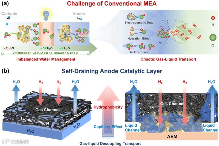 图1. (a)传统AEMFC的MEA所面临的挑战。(b)自排水阳极催化层(SD-ACL)中水和气体传输原理的俯视图和侧视图。