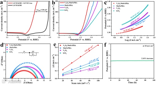 要点二:出色的催化性能:V2O5/MnFePBA催化剂表现出优异的OER和UOR电催化活性。在1.0 M KOH的电解液中,只需要260 mV的过电位就能达到100 mA cm-2的电流密度。在1.0 M KOH + 0.5 M尿素电解质中,催化剂在1.36 V的电位下可实现相同的电流密度。