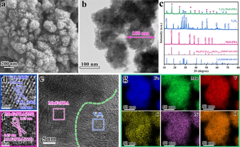 图2. MnFePBA,V2O5和V2O5/MnFePBA催化剂的形貌和结构表征。