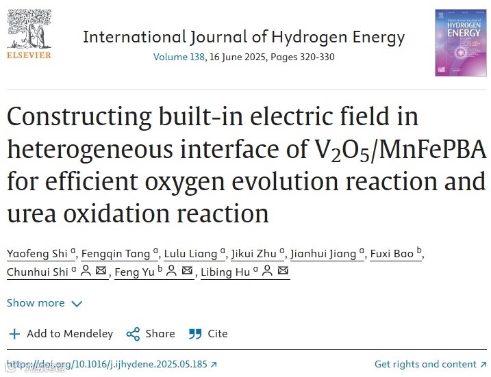 相关工作以“Constructing built-in electric field in heterogeneous interface of V2O5/ MnFePBA for efficient oxygen evolution reaction and urea oxidation reaction (https://doi.org/10 .1016/j.ijhy dene. 2025.05.185)”为题,在International Journal of Hydrogen Energy发表。
