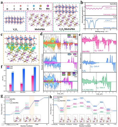本文通过简单的一步水热法成功制备了异质结V2O5/MnFePBA电催化剂。实验结果结合DFT理论计算表明,异质结界面V2O5和MnFePBA之间的ΔΦ驱动了电子从V2O5 到MnFePBA的定向运动,从而形成BIEF。BIEF可以调节活性位点的电子结构,从而诱导ɛd的偏移,优化中间体的吸附/解吸行为,降低速率决定步骤的能量势垒,从而显著提高V2O5/MnFePBA的电催化活性。由于这些优点,V2O5/MnFePBA电极对OER和UOR具有巨大的电催化活性。因此,在碱性电解质(1.0 M KOH)中,V2O5 /MnFePBA仅需要260 mV的过电位即可获得100 mA cm-2的高电流密度。此外,在由1.0 M KOH+0.5 M尿素组成的混合电解质中,它在1.36 V vs.RHE的低电势下实现了相同的电流密度。综上所述,我们成功构建了一种具有BIEF的异质组分电催化剂,可以有效地提高OER和UOR性能,从而为设计双功能电催化剂提供了一种新的方案,以促进绿色能源利用和解决含尿素废水问题。
