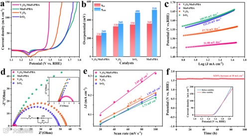 要点三:优异的稳定性:催化剂连续工作12小时后,电势仅略微提高1.30%,稳定性测试后的极化曲线与初始值完全重合,表明V2O5 /MnFePBA异质结构具有出色的稳定性。