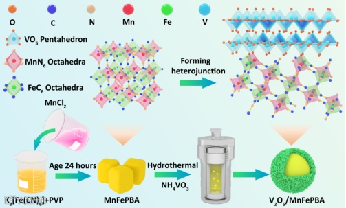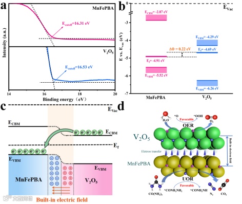 最近,塔里木大学时春辉老师、胡立兵副教授和石河子大学于锋教授合作在电催化OER和UOR领域取得重要进展,成功开发出一种高效稳定的V2O5/MnFePBA催化剂。该工作利用V2O5包覆在MnFePBA纳米球表面,从而形成具有内建电场(BIEF)异质结构。实验与理论计算表明,异质结两侧的半导体表现出显著的功函数差异,这驱动了V2O5向MnFePBA的定向电子转移,从而形成了稳定的BIEF。由于BIEF的存在,V2O5/MnFePBA在催化OER和UOR过程中显示出优异的催化活性和较高的稳定性。