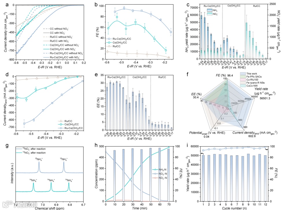 在2000 ppm NO₃⁻下,Ru–Co(OH)₂/CC显示出优异的NO₃RR性能。