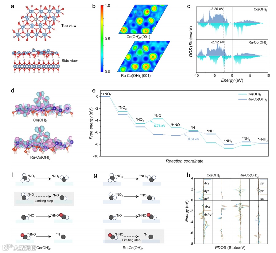Ru–Co(OH)₂的d带中心向Fermi能级靠近,增强NO₃⁻吸附。
