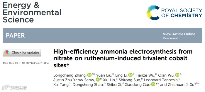 2025年5月13日,四川大学郭孝东教授/南洋理工大学徐梽川院士团队在Energy & Environmental Science期刊发表题为High-efficiency ammonia electrosynthesis from nitrate on ruthenium-induced trivalent cobalt sites的研究论文,团队成员张龙程为论文第一作者,四川大学郭孝东教授、南洋理工大学徐梽川院士为论文共同通讯作者。