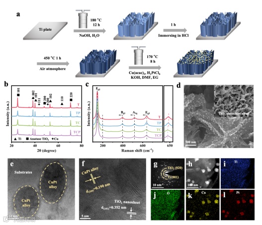 采用两步水热法成功制备了TiO2/CuPt复合材料(图1a)。为简化表述,将TiO2、TiO2/Pt、TiO2/Cu及TiO2/CuPt分别标记为T、TP、TC与TCP。XRD分析显示样品呈现锐钛矿相TiO2的特征衍射峰(JCPDS #21-1272)(图1b)。拉曼光谱进一步验证了XRD结果,所有样品在均呈现锐钛矿相的特征峰(图1c),表明负载助催化剂后TiO2的晶体结构保持完整,而峰位偏移可归因于合金化引起的界面电子相互作用。通过场发射扫描电子显微镜(FESEM)、透射电子显微镜(TEM)及高分辨TEM(HRTEM)对CuPt合金的形貌进行了系统表征(图1d-1g)。结果显示,纳米合金颗粒(d < 40 nm)均匀分布于TiO2纳米阵列表面,其晶格条纹间距分别为0.190 nm与0.352 nm,对应CuPt的(200)晶面及锐钛矿TiO2的(101)晶面。能量色散X射线光谱(EDS)面扫分析(图1h-1l)证实TCP颗粒中Cu与Pt元素共存且分布一致,表明Cu-Pt对主要由完全暴露且高度分散的CuPt合金构成。
