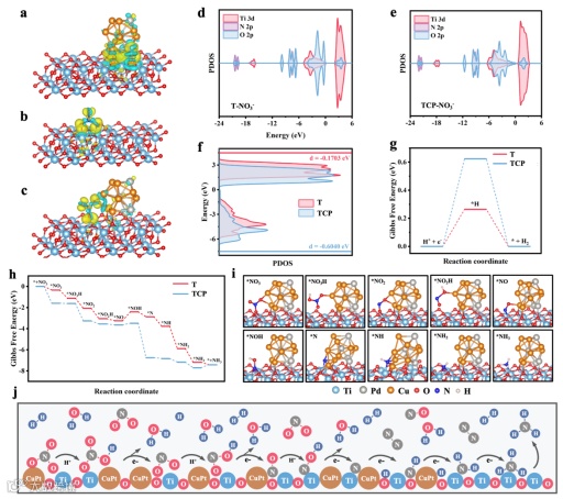 图5。差分电荷a)T上的CuPt,b)T上的*NO3,c)TCP上的NO3,吸附在d)T)和e)TCP界面的*NO3中间体的PDOS,f)T和TCP的Ti 3d波段中心,g)H*中间体吸附在T和TCP上的H*中间体吸附的自由能)在T和TCP 上NO3-RR上产生的不同中间体的自由能图,i)TCP上的相应中间体,j)还原合成NH3的途径。