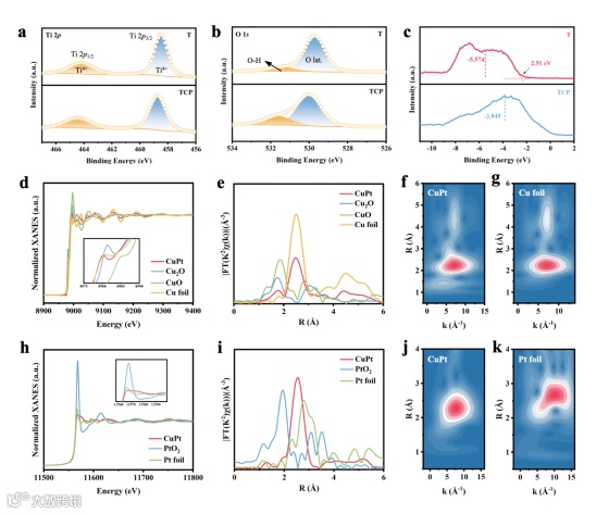 图2.a)Ti 2p和b)O 1s的XPS,c)d带中心位置和价带的XPS价带光谱,d-g)XANES光谱,k2加权傅里叶变换EXAFS光谱,以及k2加权小波变换Cu K-edge的EXAFS光谱,h-k)XANES光谱,k2加权傅里叶变换EXAFS光谱,以及Pt L3边缘的k2加权小波变换EXAFS光谱。